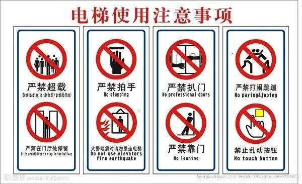 五、乘坐电梯时,注意不要超载,超载时,电梯内的警铃会鸣响,超载乘客应自觉下梯等候;如果此时乘客强行挤入电梯,情况严重时可能会导致拽引绳打滑,电梯厢下滑坠落。